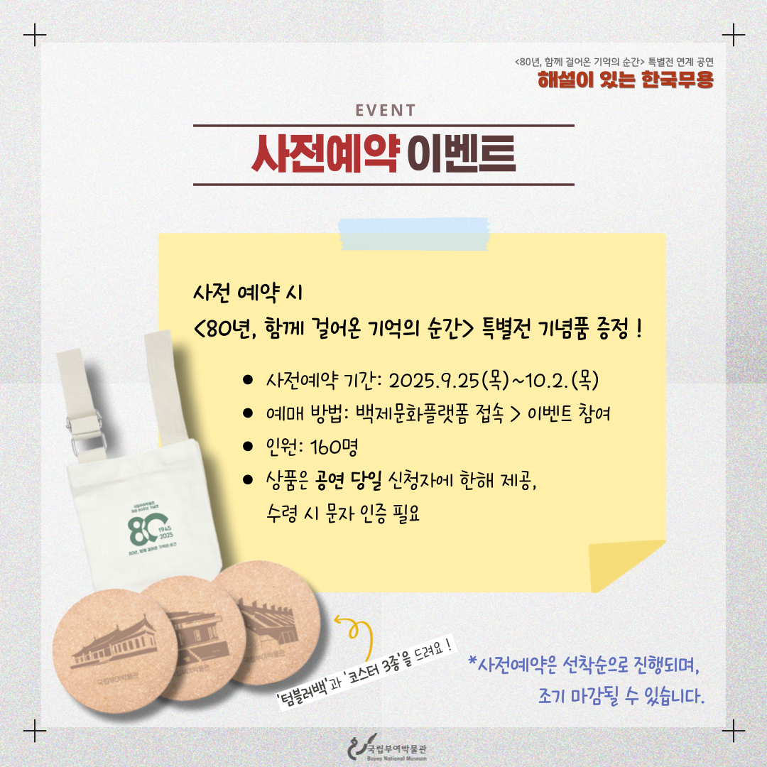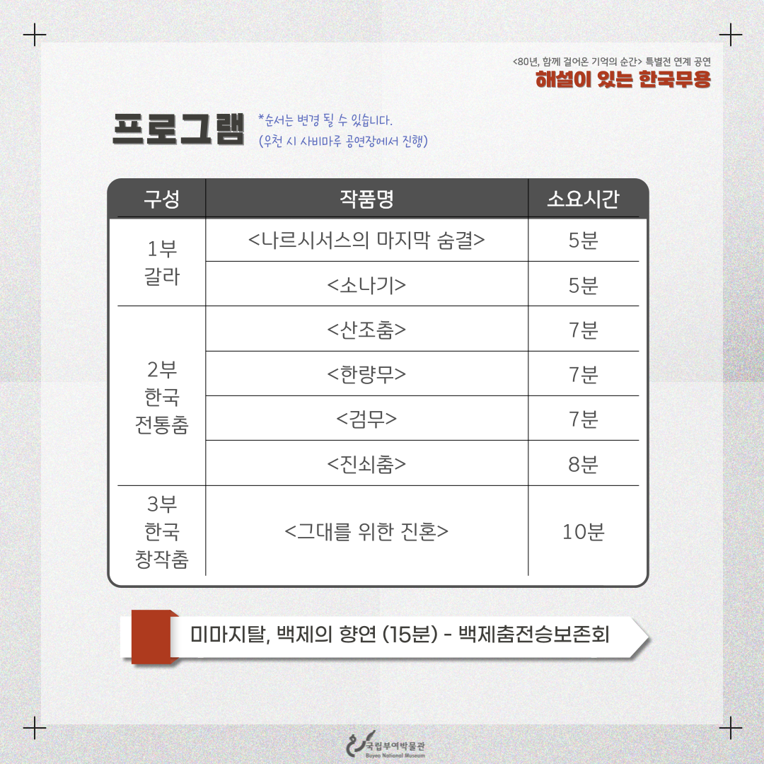 특별전 <80년, 함께 걸어온 기억의 순간>을 기념하는 연계 공연이 2025년 10월 4일 토요일 오후 3시 상설전시실 앞 야외마당에서 펼쳐집니다!